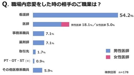 2、医師の職場恋愛のお相手、最も多い職業は〇〇